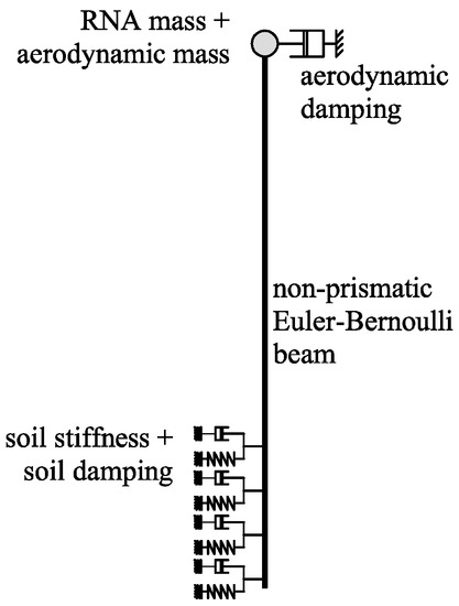 As a further simplification, the rotor-nacelle assembly and the support structure can be analysed in separate models. This so-called decoupled analysis finds practical application in the sequential design procedure, as described in Section 2.1, and in studies solely focussing on either the rotor sub-system or the support structure. The decoupled analysis of the support structure requires the definition of adequate boundary conditions at the tower top, as a substitute of a full rotor model. As an example, Figure 4 illustrates a decoupled support structure, modelled as a non-prismatic Euler-Bernoulli beam, in which the rotor-nacelle assembly is replaced by a concentrated mass at the tower top, an approach which is adopted in many studies [33,42,43], sometimes supplemented by the mass moments of inertia of the rigid rotor [44], so that the contribution of the rigid body motion of the rotor-nacelle assembly to the dynamic characteristics of the support structure is accounted for. In this example, the aerodynamic interaction is accounted for by an apparent mass and damping, whereas the soil-structure interaction is represented by distributed springs and dashpots. More realistic representations would account for frequency dependency of the interactions, as well as their non-linear character. Figure 4 does not present the apparent dynamic characteristics of the hydrodynamic interaction—mass and damping—which could affect the global dynamic characteristics of the system too.