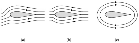 Schematic representation of the streamlines of an inviscid flow around an aerofoil, with (a) the attached flow for a small angle of attack, (b) a symmetric flow pattern, and (c) the induced circulatory flow.