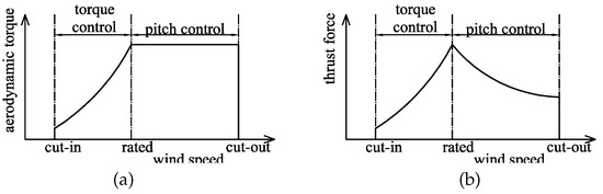 Figure 6 depicts the aerodynamic torque and the thrust force on a turbine rotor as a function of the upstream wind speed. At relatively low wind speeds, when the generator does not produce its rated power, the rotational speed of the rotor is controlled by the generator torque. For above rated wind speeds, the torque is kept constant through a pitch control system [46,47]. Whereas the aerodynamic torque extracts the energy from the airflow, the wind turbine is exposed to a thrust force, and tilt (Or pitch, the common term in aviation, which in the context of wind turbines may lead to confusion with the control system) and yaw moments too, as well as relatively small side and upward forces.