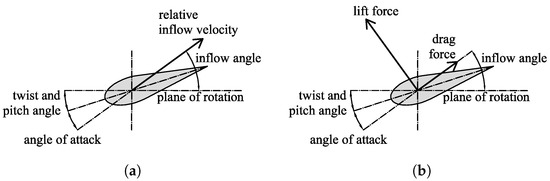 To a lesser extent, the viscous drag of the flow on the blades contributes to the forcing. Both lift and drag are a function of the relative flow conditions, on the one hand composed of the inflow wind speed and the rotational velocity of the rotor, and on the other hand affected by the structural motions, see Figure 7. The dependency of the aerodynamic forcing on the relative motion is non-linear and history dependent (An aerodynamicist would speak of ‘unsteady’, which is ambiguous in the field of structural dynamics), implying that the load at a certain instance in time depends on the foregoing flow states. Besides, both forces depend on the inflow angle, or the angle of attack, which is defined as the inflow angle minus the geometrical twist and pitch of the blade. Structural motions induce variations in the angle of attack. For small angles of attack, the dependency of the drag force is negligible, as opposed to the lift force, which moreover is strongly affected by the variations in the angle of attack. The aerodynamic aerofoil forcing has been addressed in both the frequency-domain and the time-domain in the historical works by [48,49].