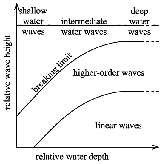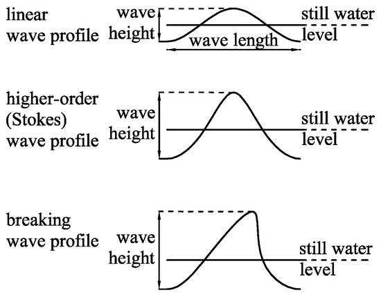 The implementation of the hydrodynamic excitation requires the selection of valid wave and force models. Figure 9 illustrates the validity of different wave theories for varying water depths and wave heights. Provided that the wave steepness is small, the waves can be modelled linearly. The linear wave theory can be applied straightforwardly to define stochastic sea states too. For shallow waters and/or high waves, the linear wave theory is no longer valid and the definition of the wave profile requires higher-order harmonic corrections [76,77], or breaking wave theory should be adopted. The profiles of these different waves is depicted in Figure 10 and an overview of the different wave theories can be found in [78].