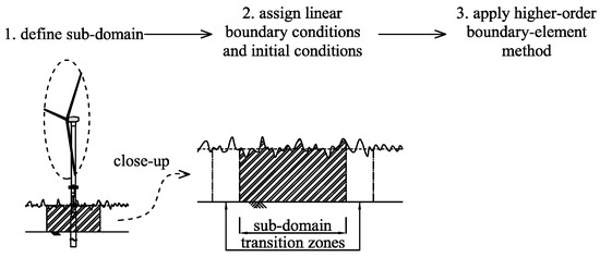 In practical situations, non-linear waves are defined deterministically. To analyze the response to non-linear waves in a random sea, Ref. [79] suggested that a linear stochastic wave model could be applied to determine the initial conditions for the assessment of the excitation of a regular non-linear wave. The propagation of non-linear gravity waves in irregular seas can be evaluated with the potential theory, using non-linear free surface boundary conditions. Ref. [80] generated irregular nonlinear wave profiles by employing the second-order correction proposed by [81]. To increase the computational efficiency, Ref. [82] proposed a domain-decomposition strategy, in which the occurrence of non-linear waves is assessed in a linear irregular wave profile, after which a non-linear wave profile is determined to replace the linear profile in a sufficiently large domain, using a higher-order boundary-element method. This approach is schematized in Figure 11.