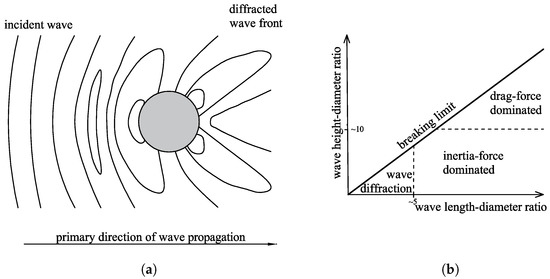 Once the wave kinematics have been adequately defined, the Morison equation can be employed to predict the resulting forces on submerged vertical slender cylinders [83]. The equation distinguishes the inertia force, composed of the Froude-Krylov and the added mass components—as predicted by the potential flow theory—and the drag force resulting from the viscosity of the flow, and requires the definition of time-averaged added mass and drag coefficients, which depend on the shape of the structure, the Reynolds regime and the history of the relative motion between fluid and structure. The empirical Morison equation can be applied to structures that do not significantly affect the incident wave field, provided that the predicted force is either drag or inertia dominated [84]. This is illustrated by Figure 12, with Figure 12a depicting the disturbance of the incoming wave field by a cylindrical structure, and with Figure 12b indicating the governing hydrodynamic force on a cylinder based on the ratios between the wave length and height and the diameter of the cylinder. For shallow waters and/or non-slender cylinders, the effects of wave diffraction and reflection can no longer be neglected. On the basis of linear potential theory, and therefore linear waves, Ref. [85] derived the hydrodynamic inertia force for a cylinder, accounting for both effects. For an elaborate overview of the wave force models on cylindrical structures, reference is made to [84,86].