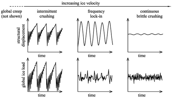 Illustrations of ice-load and structural-response patterns of vertical-sided structures in interaction with ice with varying speed. Adapted from ‘Dynamic response of an offshore structure interacting with an ice floe failing in crushing’ by Hendrikse, H. and Nord, T. S. (2019), Marine Structures, 130, p. 274. Copyright 2019, Elsevier Ltd.