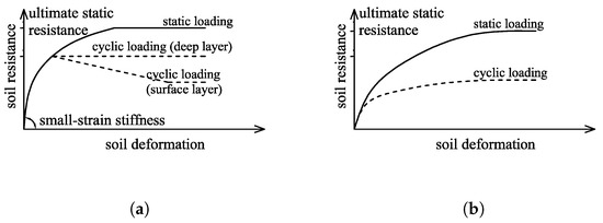 Representations of p − y curves for (a) clay and (b) sand, distinguishing the soil-structure interaction for static or cyclic loading.