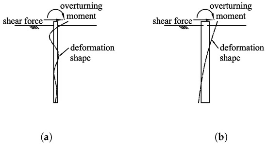 Schematic representation of the lateral pile deformation resulting from a shear force and overturning moment at the soil surface, distinguishing (a) a flexible pile and (b) a rigid pile.