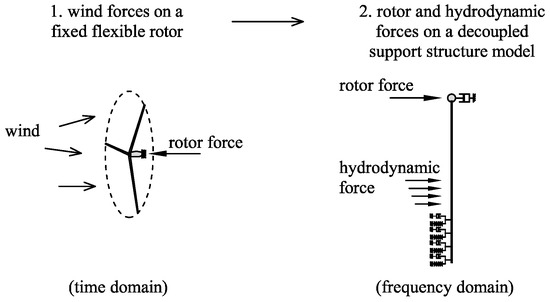 A popular approach used to reduce the computational time of offshore wind turbines simulations (ii) entails the decoupling the turbine and support structure models. The reason behind this can also be partially attributed to the current offshore wind industry practice. The integrated design of offshore wind turbines is not a common practice, since the turbine manufacturer and the foundation designer usually do not share the details of their structural designs. As a consequence, the communication between these two parties takes place in terms of interface loads. Therefore, the need to investigate the consequence of the application of decoupling methods is pressing. Ref. [16] looked into the accuracy of the decoupling of the turbine and support structure models. The authors compared the fore-aft response computed with a fully coupled simulation and a decoupled simulation of a jacket-based offshore wind turbine. From the analysis, reasonably comparable values for the mean and standard deviation of the structural response for wind-governed load cases were obtained. Ref. [17] compared results obtained from a fully integrated simulation and those of a decoupled system accounting for linear aerodynamic damping. The results showed that even if the aerodynamic damping is nonlinear, it is possible to match the results of a fully coupled—or integrated—simulation if optimization of the damping ratios for different wind speeds is performed.