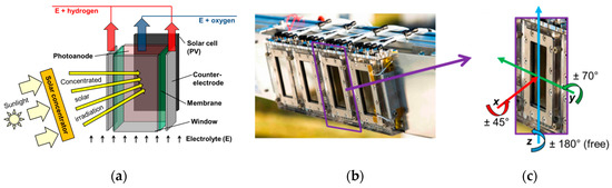 (a) Illustration of the main parts of the CoolPEC cell (without body), in particular oblong photoanode and solar cell provided with concentrated irradiation from a solar concentrator, (b) CoolPEC module in the focal plane of the SoCRatus and (c) one of the incorporated photoelectrochemical (PEC) units with a 50-cm2 active cell area along with the reference Cartesian coordinate system and tilt constraints with respect to rotational axes.