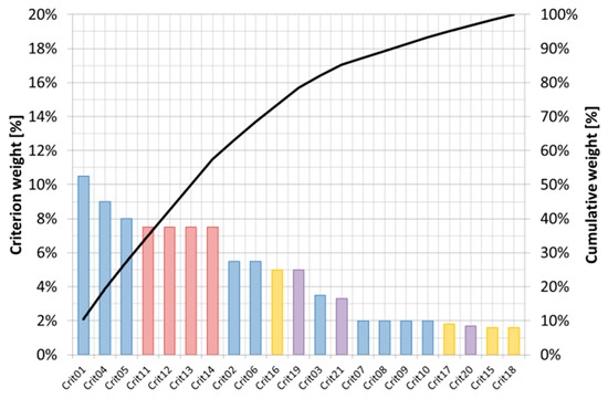 Ranking of compound weights for design criteria (Pareto chart). Criteria highlighted according to related functional requirement: F1 → blue, F2 → red, F3 → yellow, F4 → purple.