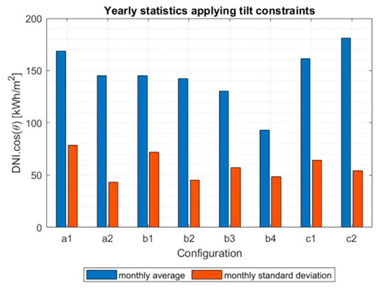 Config. b2 shows minimal losses due to tilt constraints (−2%) and minimal yearly variability. Operational time is about 88% for Config. b2, with downtime occurring in the morning and evening hours during winter months for Seville, Spain. For Config. b1, higher losses due to tilt constraints are observed (−12%), along with higher yearly variability, lower daily variability, but a higher available solar radiation potential in comparison to Config. b2. Config. b1 is penalized by tilt restrictions all year round during morning and evening hours (operational time fraction: 72%).