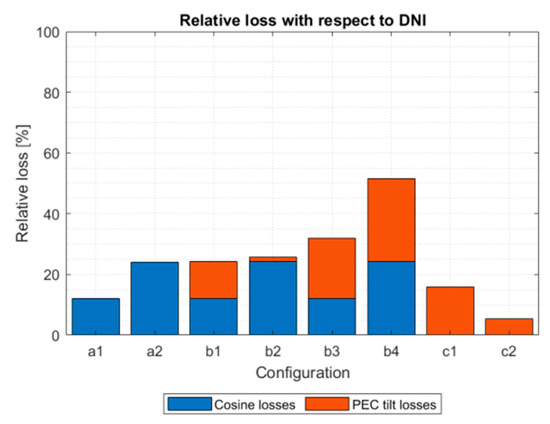 The geometrical analysis includes the following set of criteria: (a) maximum available DNI (kWh/m2), weighted by the incidence angle cosine and applying PEC(-PV) device tilt angle restrictions to discount corresponding non operational time windows, (b) monthly average (µ) direct normal irradiance weighted by incident angle cosine and yearly standard deviation (σ) for the assessment of yearly variability, (c) qualitative shape of the daily profile for the assessment of intra-day variability, (d) yearly incidence angle cosine losses with respected to the reference yearly DNI value (2300 kWh/m2/year), (e) losses due to PEC(-PV) device tilt restrictions (Figure 1c) with respect to yearly DNI, (f) PEC(-PV) device tilt angle statistics, excluding operational downtime induced by device tilt restrictions, and (g) operational time fraction (%). The main results of the geometrical analysis are summarized in Table 6 for Seville, Spain.