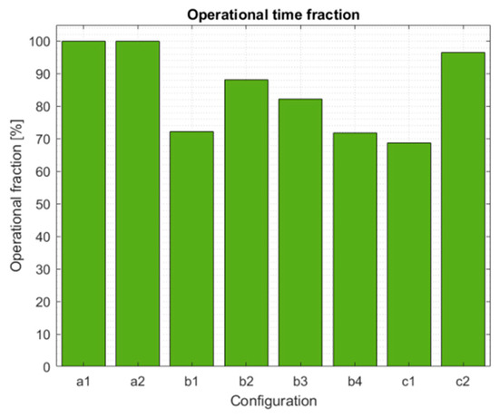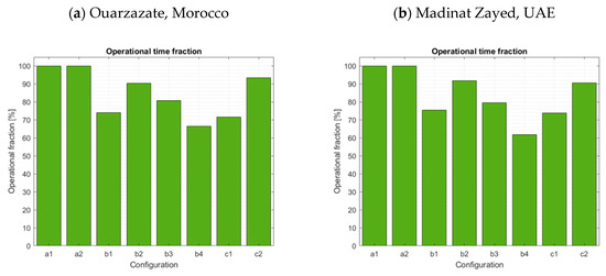 It is worth observing in Figure 7 and Figure 8 that the global hierarchy among all configurations, previously observed in Figure 4 and Figure 6, remains nearly identical for both sites closer to the Equator. However, minor differences can be noticed for Config. c1 and c2. As the latitude decreases, relative losses caused by PEC(-PV) tilt constraints are, respectively, decreasing for Config. c1 and increasing for Config. c2. Config. c2 still performed better than Config. c1 for Ouarzazate, but this was not the case for Madinat Zayed. A similar pattern can be observed for the operational time fraction, although Config. c1 still achieved the highest level. Numerical values are reported in Table 8 for both configurations.