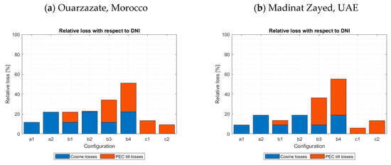 The geometrical analysis carried out above for the reference location was transposed to two other locations in the Northern hemisphere at a lower latitude closer to the Equator, i.e., Ouarzazate, Morocco and Madinat Zayed, United Arab Emirates. Both sites are located in “sunny” regions near desert areas, weather data are retrieved from CAMS radiation service [43] for the year 2019. The geographical coordinates are summarized in Table 7. The relative losses with respect to DNI and the operational time fraction for both sites are, respectively, shown in Figure 7 and Figure 8.