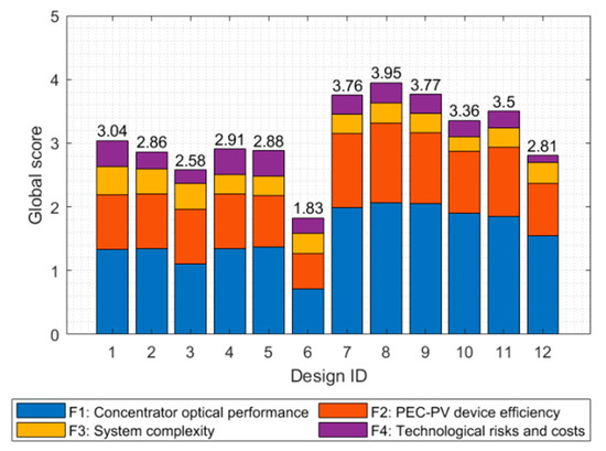 Main functional requirements and corresponding design criteria were weighted according to their relative importance, applying a ternary logic scale and round-robin matrices. This weighting mechanism is illustrated exemplarily in Table 1 for the inter-comparison of main functional requirements. Solar concentrator optical performance was perceived as the dominant functional requirement (F1, weight: 50%), followed by PEC(-PV) device efficiency (F2, 30%), perceived system complexity (F3, 10%), technological cost and risks (F4, 10%).