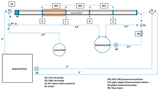 The flow rate was measured using am Optiflux 4000 electromagnetic flow meter (Krohne, Duisburg, Germany) that was mounted downstream of the main pump Q2 as shown in Figure 2. To measure the pressure losses along the annulus, three differential pressure (DP) cells of type Fuji were used, see Table 3. These measured the differential pressure across three sequential 2 m sections of the test section. The pressure cell DP1 was used for measuring the gauge hole annular pressure losses. The other two DP cells had one or two pressure outlets mounted near the washout section and the corresponding pressure measurements were affected by the diameter changes at the ends of the washout section. It turned out that DP3 was faulty and no data are available from this sensor.