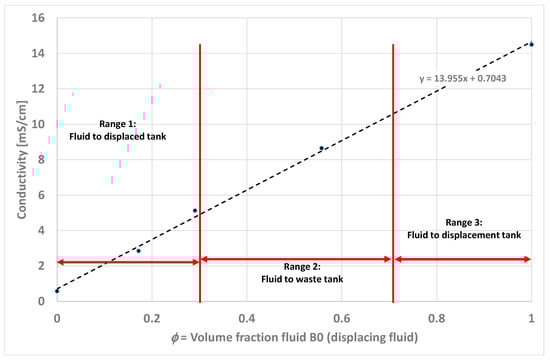 The linearity of ϕ(G) (see Equation (5)) was checked before the experiments by measuring the conductivity of a mixture of a non-conductive and a conductive water-based fluid. Thus, two prototype fluids A0 (water with 1.4% by weight of the (synthetic) clay laponite) and B0 (water with 0.8% by weight xanthan biopolymer and 1.0% by weight NaCl) were mixed in different ratios and the conductivity was measured using a handheld conductivity probe (Hanna Instruments HI933000). The results are shown in Figure 8. The measurement points indicate a linear relationship between conductivity and volume fraction, as shown by the stippled line. For such a mixture the conductivity is proportional to the volume concentration of the electrolytic ions when the concentration is sufficiently low. Note that the fluids A0 and B0 were not used in the actual displacement experiments, but represent fluid system 1, except for the omission of barite, soda ash and biocide in the displacing fluid. This omission is not expected to have any impact on the linearity of the conductivity versus composition.