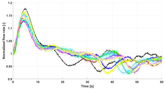Note that before the start of the displacement process the displacing fluid is recirculated with the target flow rate in a bypass loop, while the displaced fluid is circulated through the test section (see Figure 2). The flow through the test section is briefly stopped before the start of the displacement (here between −180 and −150 s) to obtain a zero reference for the DP cells. The flow meter (see symbol FM in Figure 14) is, however, mounted so that it always measures the flow rate of the displacing fluid, and the logged flow rate FM is therefore constant throughout the experiment. The flow rate of the displaced fluid before the start of the displacement, which corresponds to the pressure measurement before t = 0, was not logged, but was somewhat smaller than the flow rate FM of the displacement experiment. A small transient in FM is therefore observed as the displacement process starts due to the inertia of the fluid. In this experiment the flow rate briefly increases at t = 0 due to a small overcompensation of the pump control.