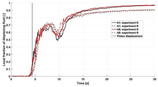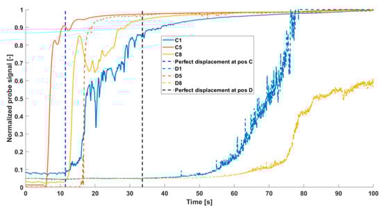Measurement of displacing fluid fraction immediately upstream and downstream of the washout section for an experiment in horizontal wellbore with concentric inner pipe. Probes C1/D1 and C8/D8 measure fluid fraction near top upstream/downstream of washout section, while probes C5/D5 measure corresponding fluid fractions near the bottom.