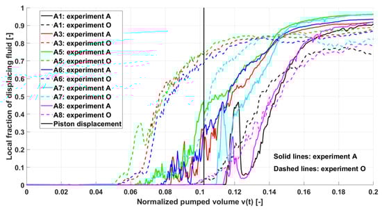 Since the scope of the measurements is to determine the displacement fluid volume fraction ϕ rather than the effective conductance G between the electrodes, we will in the following work only with the normalized probe response Vr. Since the absolute value V0 of each probe was not critical, the probes were not calibrated to give the same value for the same fluid (displaced and displacing). The offset and gain factors for each channel of the signal amplifier were adjusted prior to conducting the experiments to avoid saturation of the signal; meaning being out of range. Still this has happened in a few cases.