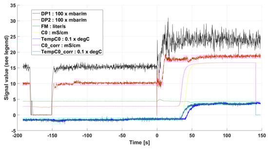 The yellow curve (C0) shows absolute fluid conductivity at the sensor at 9.5 m downstream of the test section outlet, and the blue curve shows the corresponding temperature T0. The small change in temperature is well correlated with the change in conductivity, representing the arrival of the displacing fluid at this location. The pink (C0_corr) and green (TempC0_corr) curves show the same data corrected for the time offset due to the transit time from the test section to the sensor.