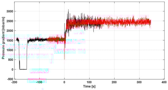 DP1 pressure gradients for the experiments shown in Figure 14 (black) and a repetition test (red).