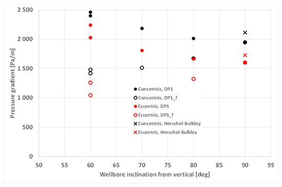 The frictional pressure gradient should not depend on inclination, assuming that the annulus between the pressure ports is filled with displacing fluid only during the measurements. However, we notice that both for concentric and eccentric annulus the correction for the hydrostatic head gives an overcompensation. A similar over-compensation is seen for the sensor DP2. This indicates that the over-compensation could, at least partly, be due to a deviation in the assumed density difference. The change in measured pressure gradient with inclination corresponds to approximately Δρ = 50 kg/m3 for both eccentric and concentric annulus. Sensor DP2 consistently gave lower pressure gradients than sensor DP1. This can be explained by the proximity of the downstream port of sensor DP2 to the washout section, disturbing that measurement. The measured pressure gradient for sensor DP1 for horizontal annulus, agreed well with calculations both for concentric and eccentric annulus, as shown in Figure 16.
