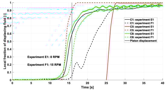 Effect of inner pipe rotation on displacement in inclined wellbore (60 degrees from vertical) with eccentric annulus (e = −0.42). Curves showing fraction of displacing fluid at station C (near inlet to washout section) without inner pipe rotation (experiment E1) and with inner pipe rotation (experiment F1). Azimuthal positions of probes (1, 5 and 8) are as shown in Figure 6.