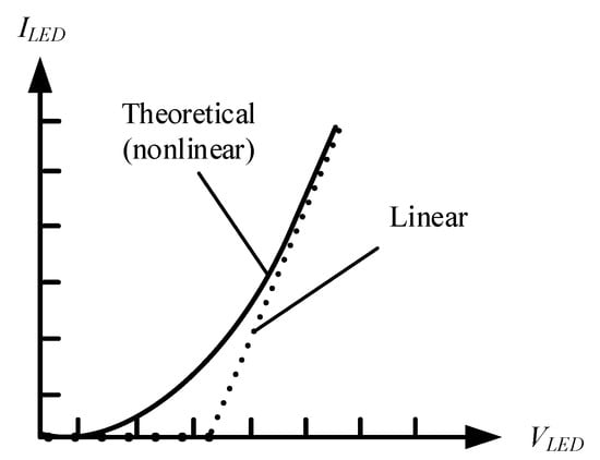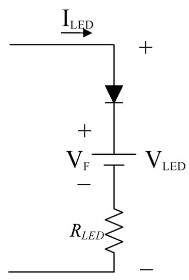 Equation (5) presents the nonlinear LED current–voltage characteristic. For VF >> VT, Equation (5) can be simplified as Equation (6), where VT is the thermal voltage, which is approximately 25 mV at room temperature: