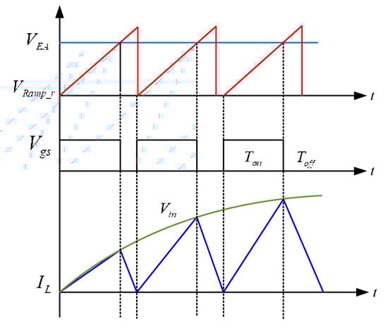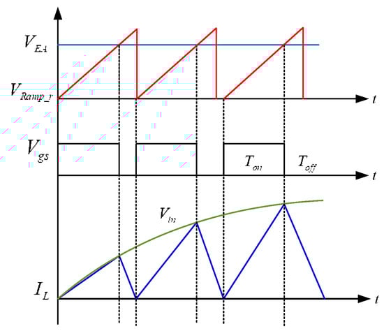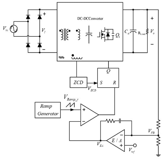 The circuit and relevant waveforms of voltage mode control (VMC) [,,] are presented in Figure 3 and Figure 4. The bandwidth of the error amplifier (E/A) is also set remarkably lower than the frequency of input voltage, and VEA is a DC voltage with extremely low ripples. After comparing the reference voltage Vref with the feedback voltage VFB, which is obtained at the output end Vo by dividing the voltage by resistances, the E/A is employed to obtain the amplified DC signal VEA, which is drawn to compared with VRampr (Figure 3). When VRampr < VEA, the power switch is on and the inductor is storing energy; whereas when the voltage VRampr increases to ≥ VEA, the R end of the RS flip-flop is instantly triggered to turn the power switch off and the inductor begins to release energy. Till the energy stored in the inductor runs out, the zero current detector (ZCD) circuit sends a wake-up signal CZCD to the S end of the RS flip-flop. Next, the RS flip-flop Q outputs a high-level signal to turn the switch back on. This action is repeated to achieve output voltage stabilization and regulation as well as high power factor. This method employs variable-frequency control in which a constant on-time Ton (Figure 4) is retained and the switching frequency varies with the input voltage and output load. The cost of VMC is lower because the multiplier is needless. In addition, the current sensing resistance in VMC is reserved simply for over-current protection.