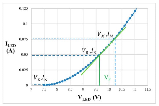 The maximum operating point (VM,IM), minimum operating point (Vk,IK), and rated operating point (VR,IR) can be obtained from the datasheet of the luminaire. Figure 7 presents the I–V curve marked with the aforementioned operating points. The rated and maximum operating points are subsequently connected to form a straight line; the internal resistance (RLED) parameter is obtained by calculating the slope of said line with Equation (10):