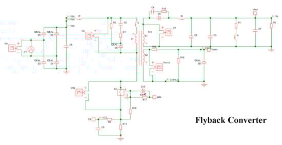 The simulation software employed in this study is SIMetrix/SIMPLIS. Figure 8 presents the flyback PFC circuit simulation framework, which contains the same main circuit as a regular flyback converter. In addition, the circuit established in this study contains a ZCD, which enables soft-switching of the switch, reduces loss, and improves overall efficiency of the system. The characteristic of this circuit is similar to that of the quasi-resonant flyback converter. Both switches are triggered when the voltage Vds reaches the wave trough.