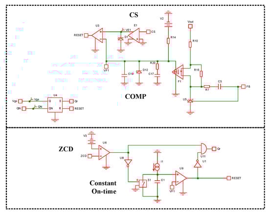 Figure 9 presents the SIMPLIS circuit control block module of PFC function and closed-loop feedback. The main control functions include four control blocks: 1. switch current sensor signal (CS), 2. closed-loop feedback signal (COMP), 3. ZCD function for the auxiliary winding of the transformer, and 4. COT control of PFC [,].
