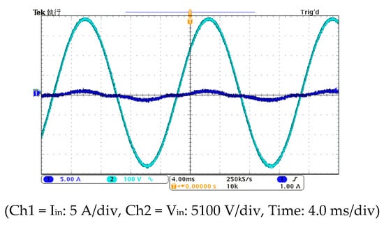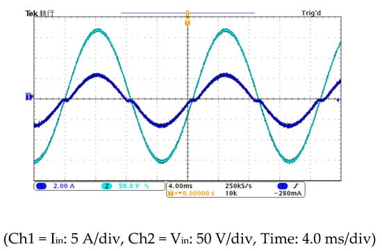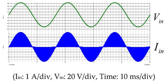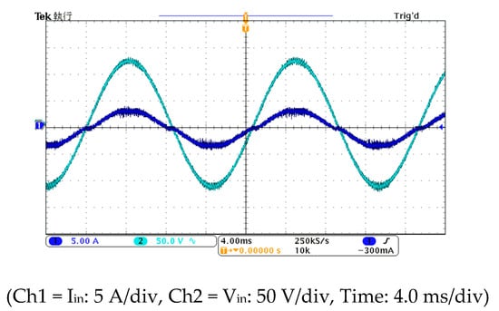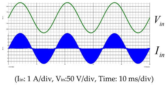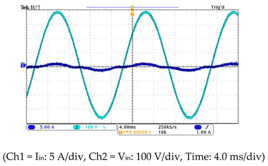 Figure 15, Figure 16, Figure 17 and Figure 18 present the input voltage Vin and current Iin waveforms of the flyback LED driver operating under a full-load (120 W) condition. Four input voltages are chosen for testing, namely 85 V, 110 V, 220 V, and 265 V.