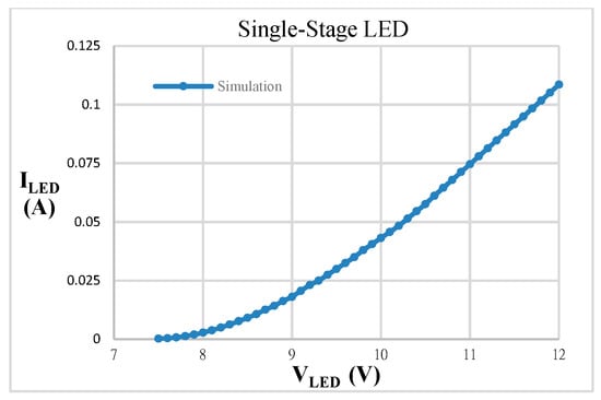 First, Figure 10 and Figure 11 show the whole system works under the normal operation conditions. The maximum output load of this system is 120 W and the input voltage is set by 85 V and 265 V individually. The input voltage and current are completely in phase and the output voltage across LED is kept at the rated voltage of 12 V. Figure 12 and Figure 13 show the current flowing through LED maintains at 0.1085 A whether the input voltage is 85 V or 265 V. The simulation results prove the system is validated for a single-stage flyback PFC converter. Next, in order to plot the simulated single-stage LEB I–V curve as shown in Figure 14, the voltage on LED is designated as the independent variable and the current through LED naturally becomes the dependent variable. After repeating several times of simulation, the acquisition of data of LED voltage and current can plot the I–V curve, which can be a benchmark for experimental results afterwards.