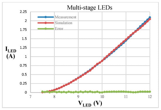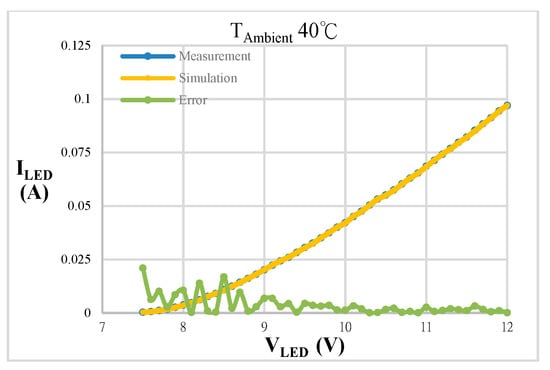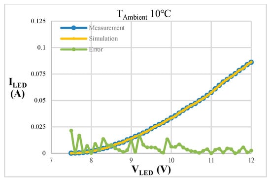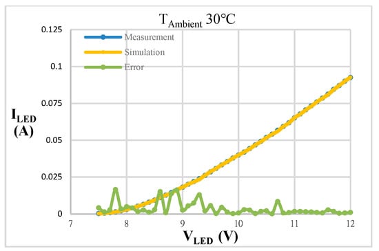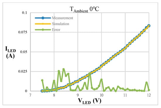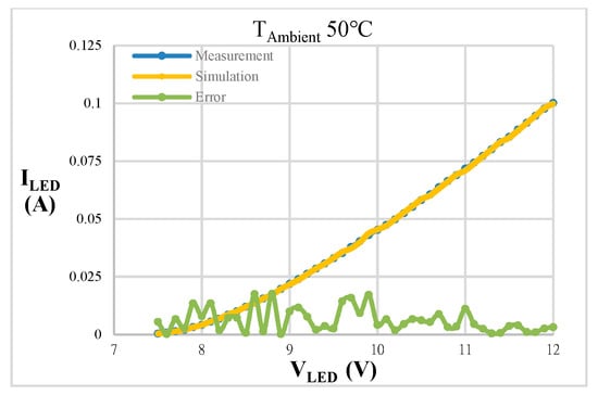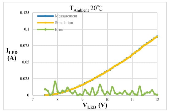 Because the LED forward voltage (VF) is a temperature dependent factor, the next work is to check if the variation of ambient temperature (TAmbient = 0 °C–50 °C) affects the errors between the simulated and measured results. When TA descends from 30 to 0 Celsius degrees, which means VF gets larger by the lower degrees as shown in Figure 21, Figure 22 and Figure 23, the errors are still below 2.14%. On the contrary, when TA ascends from 30 to 50 °C, the errors are below 2.09% in spite of the smaller VF, as shown in Figure 24, Figure 25 and Figure 26. The test results demonstrate the errors between Taylor series simulation and actual testing results can achieve temperature independent.