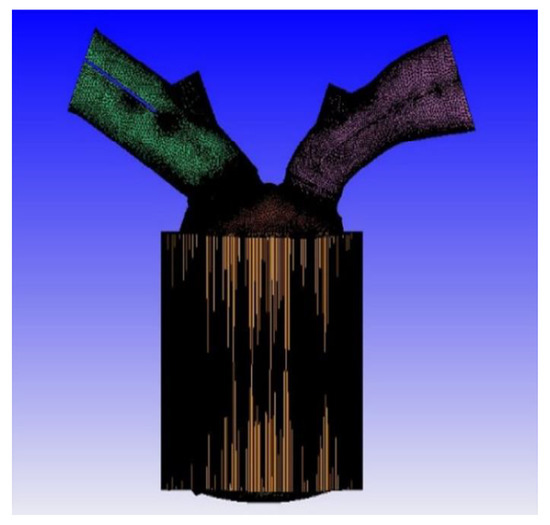 The parameters of the engine are shown in Table 1. Figure 1 shows the 3D computation model in CONVERGE (V2.3, Convergent Science, Madison, Wisconsin, USA). The grid document is the same as in our former research and was tested for grid independence in [34] to ensure the accuracy and ability of the model to meet the requirements.