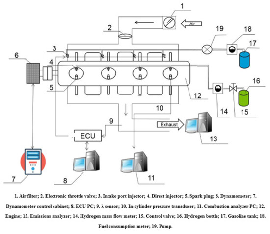 - Ji, C.; Wang, S.; Zhang, B. Combustion and emissions characteristics of a hybrid hydrogen–gasoline engine under various loads and lean conditions. Int. J. Hydrog. Energy 2010, 35, 5714–5722. [Google Scholar] [CrossRef]