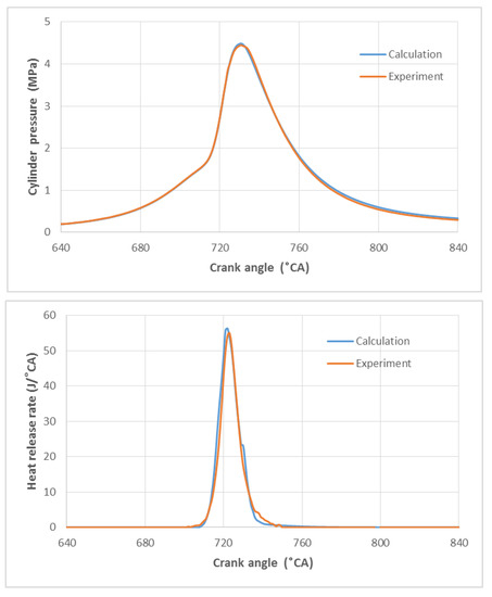 Figure 3 shows the errors between the calculations and the experiment. The condition with single HDI was under the conditions of 1200 rpm, a throttle opening of 10%, a direct injection pressure of 5 MPa, an ignition timing of 15°CA BTDC, a direct injection timing of 120°CA BTDC, a hydrogen energy fraction of 20% and an excess air ratio of 1.5.