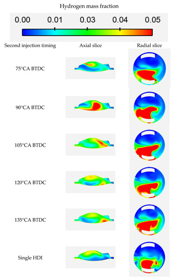 Hydrogen addition improves the efficiency of the engine in three main aspects: accelerating the ignition, accelerating the combustion rate and completing combustion [22]. Single HDI cannot do well in all aspects at the same time. Therefore, single HDI must balance the aspects to have high efficiency. As shown in Figure 4, the HMD of single HDI is rich near the spark plug, which can accelerate the ignition but cannot do well in other aspects. However, the HMD of SHDI is not only rich near the spark plug but also homogenous in other zones. By injecting hydrogen twice, SHDI can do well in all aspects. The rich mixture near the spark plug can accelerate the ignition, and the homogenous HMD can accelerate the combustion rate and complete the combustion. Since the first injection formed a more homogenous hydrogen mixture, the second injection should form a rich zone near the spark plug. As shown in the figure, early injection timing made the mixture too homogenous and late injecting timing made the mixture too rich on one side of the cylinder. As a result, there is a best second injection timing. In this work, it was 105°CA BTDC.