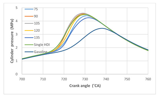 Figure 5 shows the change in cylinder pressure with different second injection timings. With hydrogen addition, the cylinder pressure increases obviously. Hydrogen addition improves the engine efficiency in three main ways: accelerating the ignition, speeding up the combustion rate and completing the combustion [22]. As the second injection timing advances, the cylinder pressure climbs to the highest value measured with a second injection timing of 105°CA BTDC. This is because early injecting timing would make the mixture too homogenous and late injecting timing would make the mixture too rich on one side of the cylinder. Since the best injection timing was set for single HDI, the pressure curve is higher than some pressure curves of SHDI but lower than the pressure curves for the second injection timings of 90°CA BTDC, 105°CA BTDC and 120°CA BTDC. Split hydrogen direct injection can form better HMD.