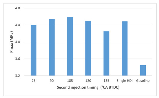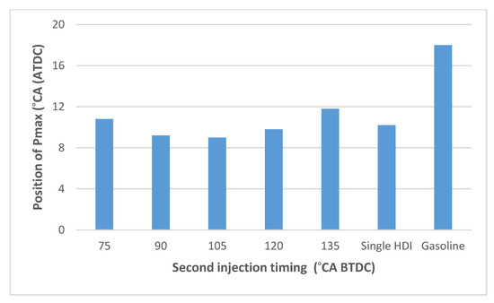 Figure 6 and Figure 7 show the change of Pmax and the position of Pmax with different second injection timings. When the second injection timing is 105°CA BTDC, Pmax is the highest and the position of Pmax is the earliest. Compared with gasoline, at the second injection timing of 105°CA BTDC, the Pmax increases by 33% and the position of the Pmax advances by 9°CA. With the second injection timing of 105°CA BTDC, the Pmax increases by 2.3% and the position of Pmax advances by 1.2°CA compared to single HDI.