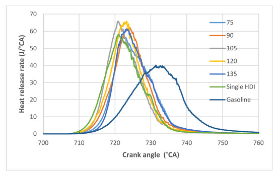 Figure 8 shows the change in the heat release rate with different second injection timings. The heat release rate with hydrogen is more concentrated and advanced. As shown in Figure 8, the ignition with single HDI is the fastest. However, the most advanced maximum heat release rate is achieved by SHDI with a second hydrogen injection timing of 105°CA BTDC. This means that single hydrogen direct injection can only do well in accelerating the ignition, and SHDI can further speed up the combustion rate to improve the efficiency.