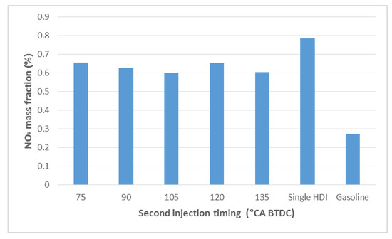 Figure 9 shows the change of NOX emissions with different second injection timings. The temperature impacts NOX emissions significantly. Since the flame temperature of hydrogen is higher than gasoline, the NOX emissions increase by 140% with hydrogen addition compared to gasoline [22]. Since the HMD of SHDI is more homogenous, the maximum temperature is less than that of single HDI [27]. Therefore, the NOX emissions with SHDI are fewer by an average of 20% compared to single HDI. As the second injection timing advances, the NOX emissions fluctuate in a narrow band.