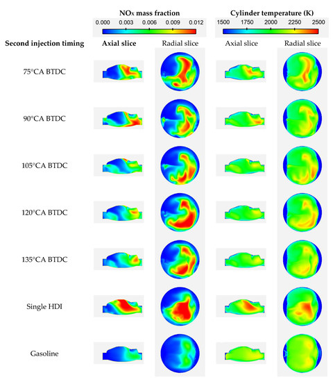 Figure 10 shows the change in the conditions of NOX emissions and the change in temperature after combustion with different second injection timings, which could indicate a similarity between NOX emissions and temperature. With single HDI, the peak temperature is obviously higher, and the NOX emissions are greater than those of SHDI. With SHDI, the homogenous HMD could reduce the size of the high temperature zone and produce fewer NOX emissions than single HDI.
