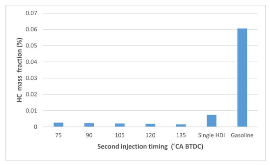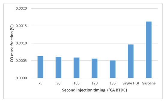 Figure 11 and Figure 12 show the change in CO and HC emissions with different second injection timings. Due to completed combustion with hydrogen addition, CO and HC emissions are obviously reduced [22]. Since the HMD of single HDI is too rich and cannot affect most of the zone in the cylinder, single HDI cannot make full use of hydrogen to limit CO and HC emissions. However, the HMD of SHDI is more homogenous and hydrogen can affect the majority zone of the cylinder. As a result, SHDI produces fewer CO and HC emissions than does single HDI [27]. Compared with single HDI, CO and HC emissions with SHDI are respectively reduced by 40% and 72%. As the second injection timing advances, the CO and HC emissions continue to decline. When the second injection timing is 135°CA BTDC, the CO and HC emissions respectively decrease by 20% and 40% compared to the second injection timing of 75°CA BTDC. As the injection of hydrogen makes the HMD more homogenous earlier, the hydrogen can affect a larger zone.