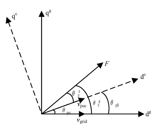 The following section will establish a dynamic mathematical model of the grid-connected system. There are two dq reference frames in the dynamic mathematical model, namely the PLL-based dq frame and the grid-based dq frame. The PLL-based reference frame aligns its d-axis with the PCC voltage space vector vpcc through the PLL output phase. Meanwhile, the grid-based reference frame has its d-axis aligned with the grid voltage space vector vgrid [10,17]. Superscripts ‘c’ and ‘g’ represent variables in the PLL-based reference frame and the grid-based reference frame, respectively. Phasor diagram of the component in different reference frames is shown in Figure 2.