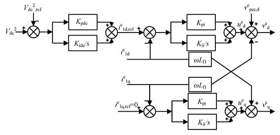 where x1, x2 and x3 represent intermediate state variables. Kpdc and Kidc notate DVC proportional gain and integral gain, respectively. Kpi and Kii are the proportional gain and integral gain of the inner current control loop, respectively. Subscript ‘ref’ denotes the system reference value.