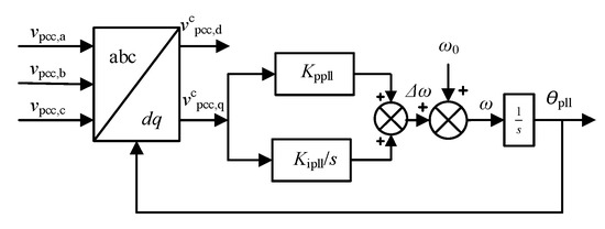 PLL uses the three-phase voltage at PCC bus as inputs to obtain the phase of the PCC voltage to achieve synchronization between the wind farm and the grids. The control block diagram of the PLL is illustrated in Figure 4. The PLL principle has been well documented [26] and will not be discussed here. ω0 represents the rated angular frequency of the grids. Δω notates the frequency deviation. θpll is the voltage phase of the PLL output. Kppll and Kipll denote the PLL proportional gain and integral gain, respectively. PLL dynamic mathematical model can be expressed as