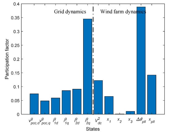 When the active power output of the wind farm is maintained at 0.8 pu, the eigenmatrix is used to calculate the eigenvalues of the system as shown in Table 3. It can be observed that there are four oscillation modes in the target system, of which λ6,7 and λ9,10 belong to the SSO mode. However, the real parts of the eigenvalues λ6,7 are positive, which indicates that the mode exhibits negative damping and the system is unstable. For this mode, the participation factors of state variables are shown in Figure 5. In Figure 5, the first six state variables represent the dynamics of the grids and the last six state variables represent the dynamics of the wind farm. Therefore, this mode is related to both the grid dynamics and the wind farm dynamics and reflects the subsynchronous interaction between the AC grids and the wind farm. As far as the control loops are concerned, the participation factors of these state variables (Δθpll, xpll, V2dc, x1) are higher. That is, PLL and DVC have a greater impact on this mode.