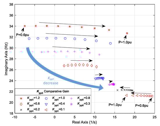 In the two cases where Kppll is selected to be larger (negative correlation) and smaller (positive correlation), the impact of the active power outputs on the mode damping with different Kipll is observed. When the active power output increases from 0.6 pu to 1.0 pu, the dominant eigenvalue is plotted as shown in Figure 8. As shown in Figure 8a, with different Kipll, the dominant eigenvalues move towards the RHP as the active power output increases and in effect decreasing the mode damping. At the same time, Figure 8b shows response with smaller Kppll value. With different Kipll, the dominant eigenvalues move towards the LHP as the active power output increases and the mode damping increases. It can be observed that adjusting Kipll does not affect the correlation between the active power output and the damping of this SSO mode. However, under the same active power output condition, the damping of the SSO mode increases when Kipll decreases. This is because the typical control parameters of a PLL are designed to ensure good phase tracking responses. However, in a weak grid, a fast PLL response will enlarge the interaction between the weak grid and the wind turbine converter, which will reduce the system stability. Therefore, a smaller integral gain is selected to improve the stability by compromising the PLL response characteristics.